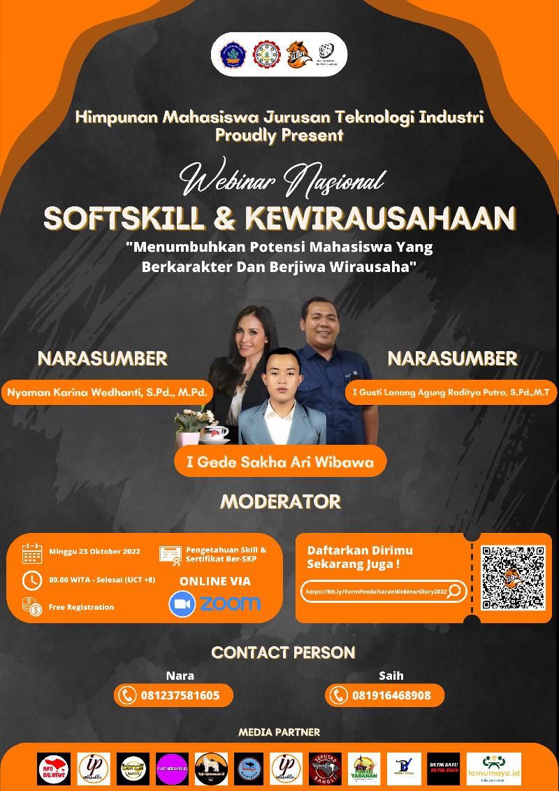 Dalam rangka kegiatan akhir tahun Jurusan Teknologi Industri kali ini Himpunan Mahasiswa Jurusan Teknologi Industri Fakultas Teknik dan Kejuruan Universitas Pendidikan Ganesha menyelenggarakan webinar tingkat NASIONAL yang dibuka untuk UMUM dengan mengangkat tema “Menumbuhkan Potensi Mahasiswa Yang Berkarakter dan Berjiwa Wirausaha”.