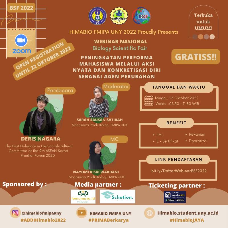 Pemuda merupakan generasi penerus yang diharapkan membawa perubahan yang terdepan dalam menghadapi dinamika kebangsaan dan situasi global yang ada. Perubahan yang diharapkan dari pemuda adalah membuat Indonesia menjadi maju. Oleh karena itu, Himabio FMIPA UNY melalui Biology Scientific Fair (BSF) 2022 akan mengadakan Webinar Nasional.
