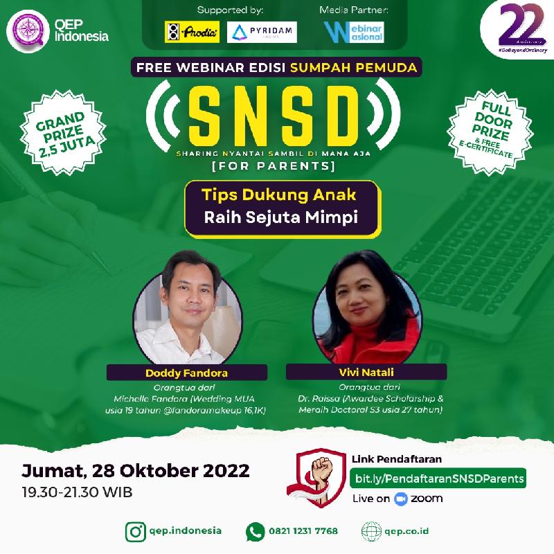 Nah, di sesi SNSD for Parents spesial Hari Sumpah Pemuda dan HUT QEP Ke-22 ini, Ayah/Bunda berkesempatan untuk sharing bersama kedua narasumber hebat dan inspiratif: Pak Doddy (orangtua dari Michelle Fandora, MUA Wedding usia 19 tahun @fandoramakeup) dan Bu Vivi (orangtua dari Dr. Raissa, Awardee Scholarship, Meraih Doctoral S3 Usia 27 tahun) mengenai apa saja tips mendukung minat anak agar sang anak percaya diri dan bisa "raih sejuta mimpi"
