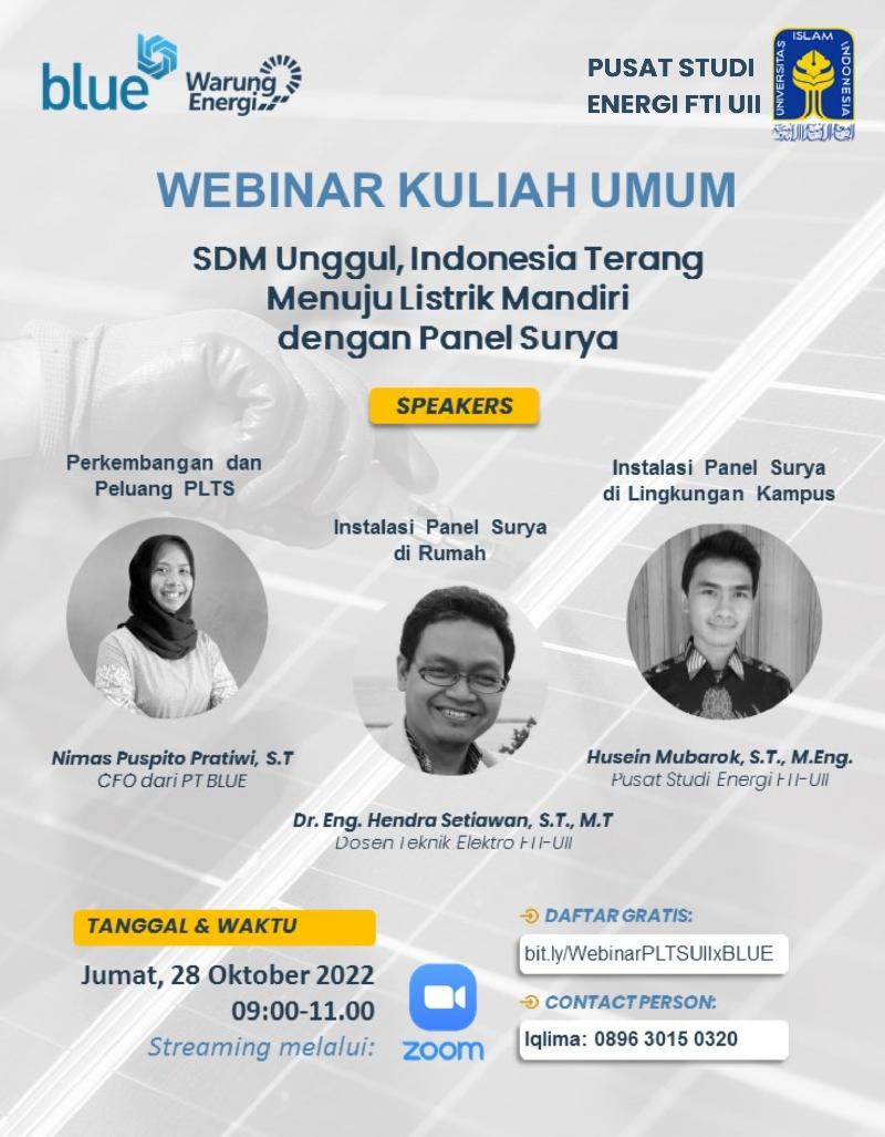 Pada kesempatan kali ini Pusat Studi Energi FTI UII dengan PT BLUE (Warung Energi) berkolaborasi mengadakan Webinar Kuliah Umum dengan judul,