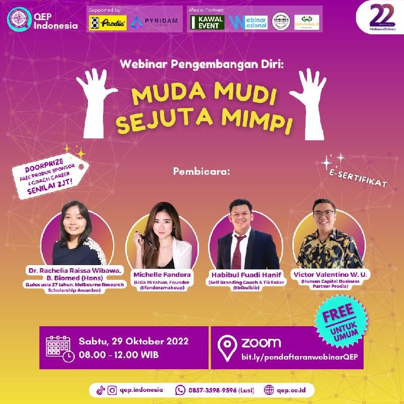 Dalam rangka memperingati HUT QEP Ke-22 dan Hari Sumpah Pemuda, yuk kita diskusi dan sharing dalam kegiatan: