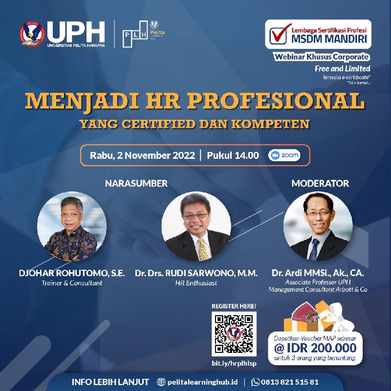 Pelita Learning Hub (PLH) bekerja sama dengan LSP MSDM Mandiri mempersembahkan webinar khusus bagi praktisi di bidang Human Resources di berbagai sektor industri. Bagaimana Anda dapat menjadi seorang HR yang Handal dan Kompeten? Dalam sesi kali ini, Pembicara akan membahas tentang profiling, apa yang diharapkan orang dari HR, serta tips dan trik menjadi HR yang Profesional serta pentingnya sertifikasi HR untuk menunjang karir Anda.