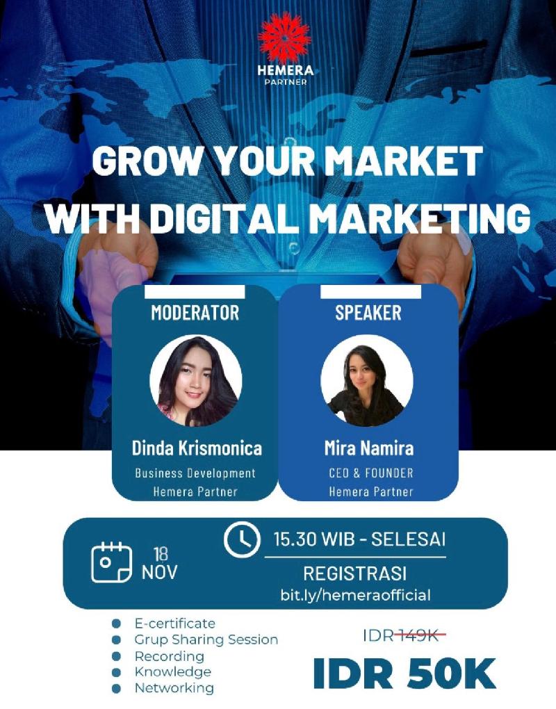 Halo sahabat Hemera, Jangan lupa ikuti Webinar Khusus Membahas Grow Your Market With Digital Marketing with Kak Mira Namira.