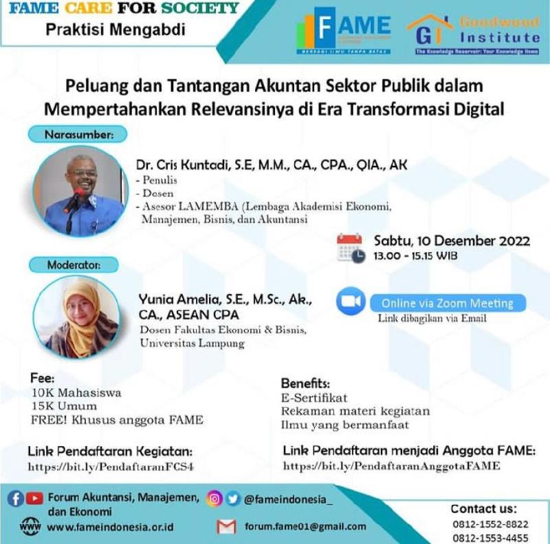 Untuk bisa beradaptasi dan terus bertahan pada era tranformasi digital saat ini, seorang akuntan harus memahami peluang dan tantangan yang ada. Mari bergabung dengan acara Webinar Nasional FAME Care for Society (FCS) yang diselenggarakan oleh Forum Akuntansi, Manajemen, Ekonomi: