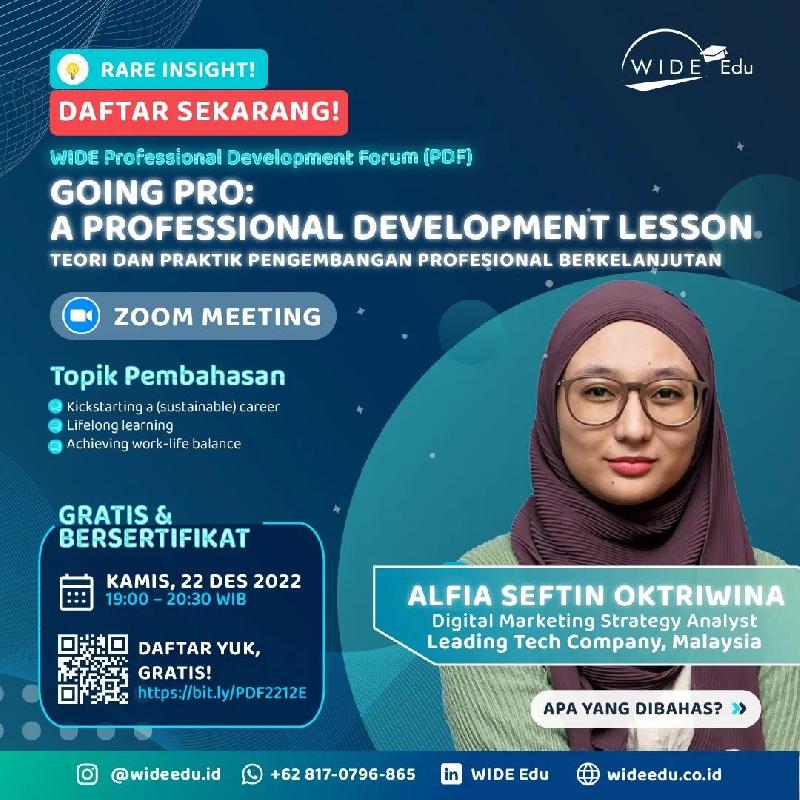 Pada Professional Development Forum kali ini, kita akan membahas teori dan praktik pengembangan profesional berkelanjutan bersama Alifia Seftin Oktriwina, Digital Marketing Strategy Analyst di salah satu perusahaan teknologi terkemuka di Malaysia.