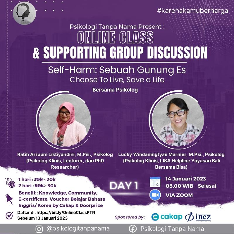 Fenomena self-harm (perilaku melukai diri sendiri) dan suicide (bunuh diri) menunjukkan minimnya kesehatan mental di Indonesia terutama ekspresi emosi dan penerimaan diri yang sehat. Fenomena bunuh diri bukan lagi angka, Emotional Health For All (EHFA) menemukan tingkat bunuh diri di Indonesia 4 kali lipat dari yang dilaporkan. Dengan fenomena seperti itu sudah saatnya kita proaktif dan mendorong masyarakat akan pentingnya kesehatan mental bukan? Bagaimana cara untuk merespon dengan tepat? Join yuk! temukan jawabannya disini pada :