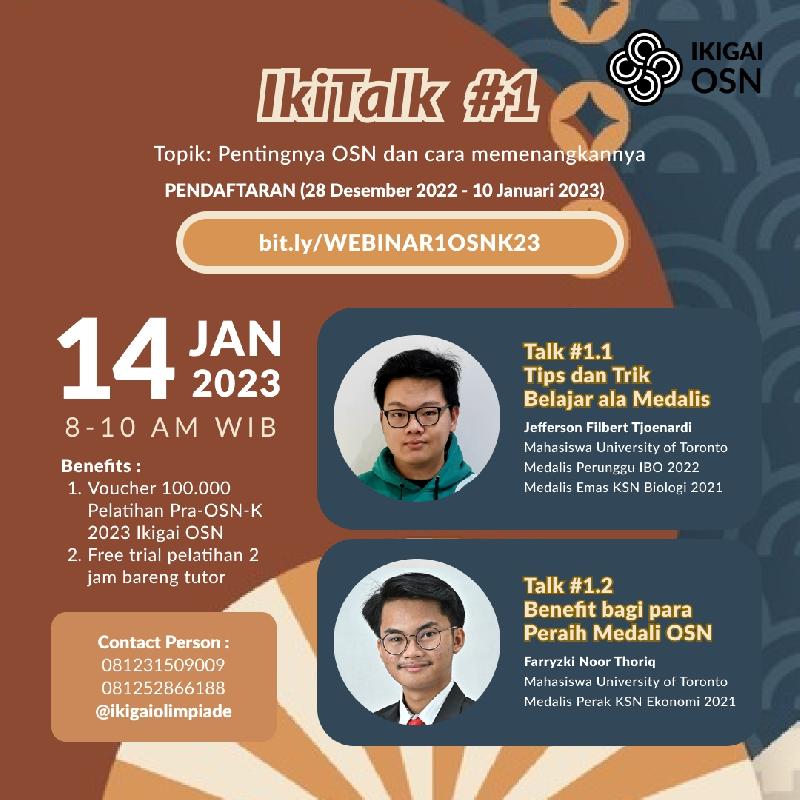 Ayo ikuti Ikitalk Batch 1 yang bertajuk “Pentingnya OSN dan cara memenangkannya” agar Ikiguys mendapat insight mengenai OSN secara keseluruhan dari dua narasumber yang berpengalaman di dunia olimpiade. Ssttt … kalian juga bisa ngobrol bareng medalis seputar kiat-kiat agar dapat kuliah di luar negeri loh...