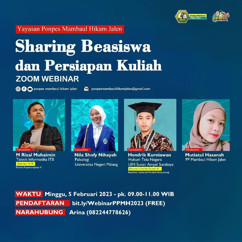 Yuk gabung dalam Zoom webinar "SHARING BEASISWA DAN PERSIAPAN KULIAH" yang diselenggarakan oleh Pondok Pesantren Mambaul Hikam Jalen, pada: