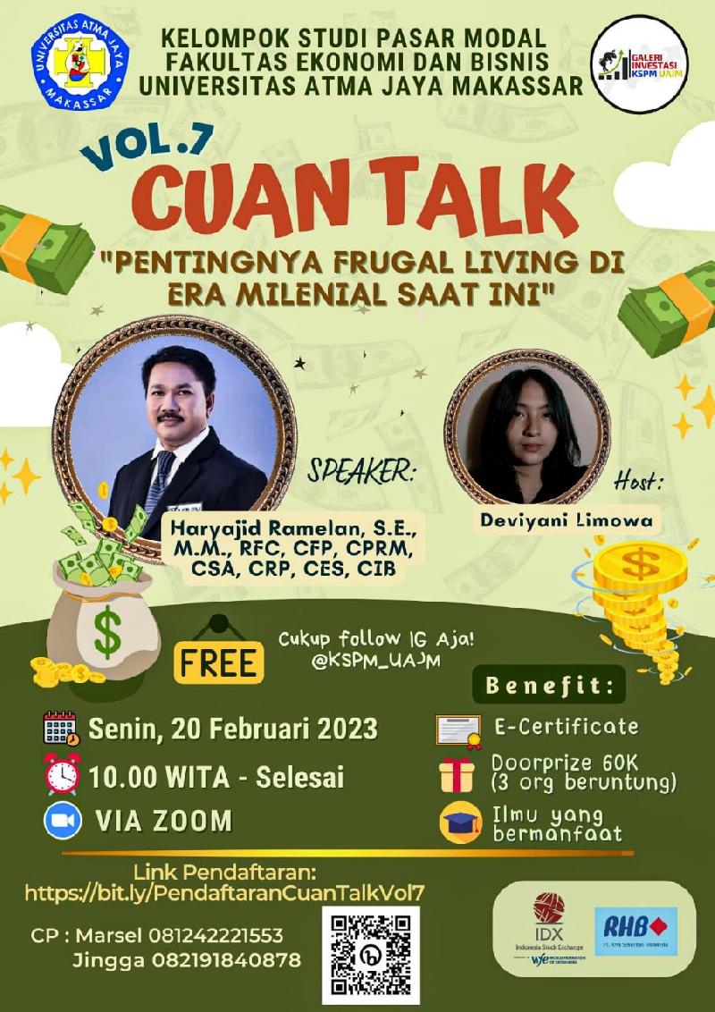 Cuan Talk Vol. 7 kali ini bertemakan "Pentingnya Frugal Living di Era Milenial Saat Ini" yang akan dilaksanakan pada:
