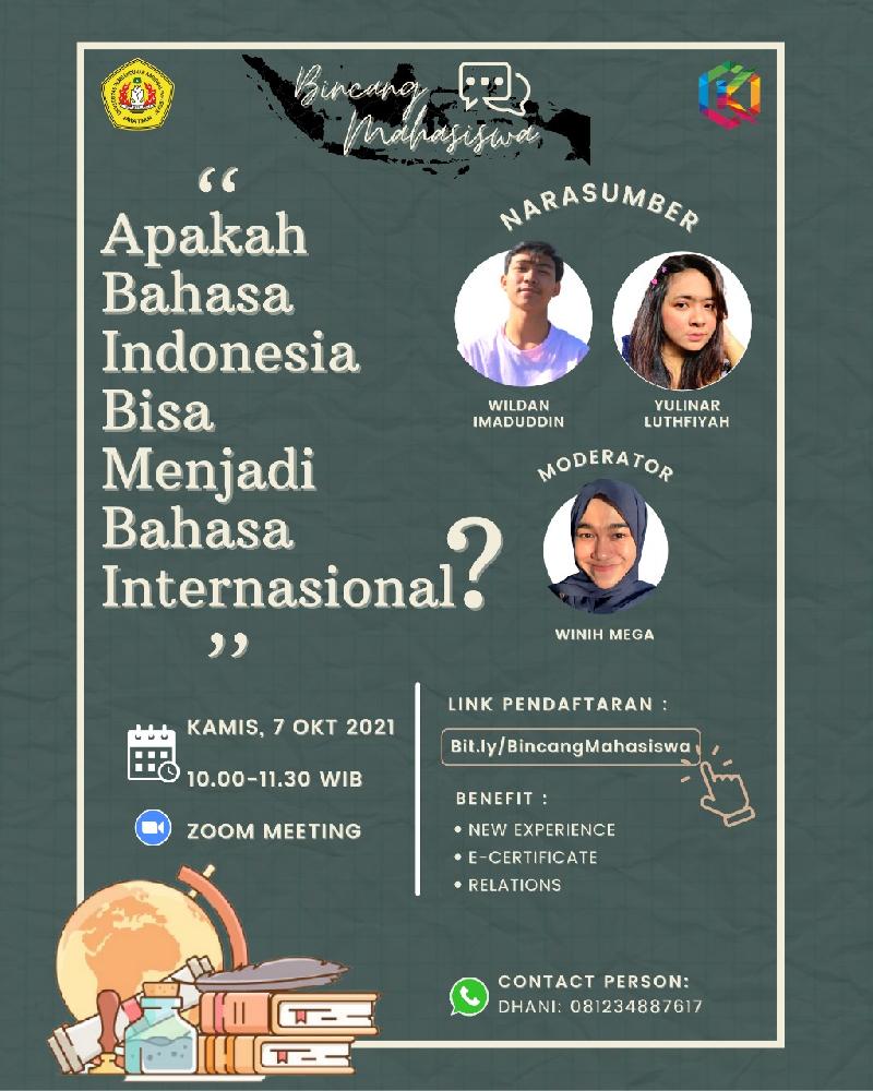 Hallo semuanya! ???? Menurut kalian apakah bahasa Indonesia bisa menjadi Bahasa Internasional? ???? Akankah ada manfaatnya jika bahasa Indonesia dijadikan sebagai bahasa Internasional? ???? Eitsss sepertinya kalian penasaran dengan jawabannya bukan? Yuk kita cari jawabannya melalui acara Webinar yang berjudul ???? " Apakah Bahasa Indonesia Bisa Menjadi Bahasa Internasional? " ???? Kita akan berbincang bersama Mahasiswa Ilmu Komunikasi UPN "Veteran" Jawa Timur yang akan dilaksanakan pada: ???? Hari/Tgl: Kamis, 07 Oktober 2021 ???? Pukul : 10.00 - 11.30 WIB ???? Media: Zoom Meeting Narasumber: ????♂️Wildan Imaduddin ????♀️Yulinar Luthfiyah Yuk segera daftarkan diri kalian untuk menambah wawasan dan relasi melalui link berikut ➡️ Bit.ly/BincangMahasiswa ⬅️ Info lebih lanjut: WA: wa.me/6281234887617 (Dhani)