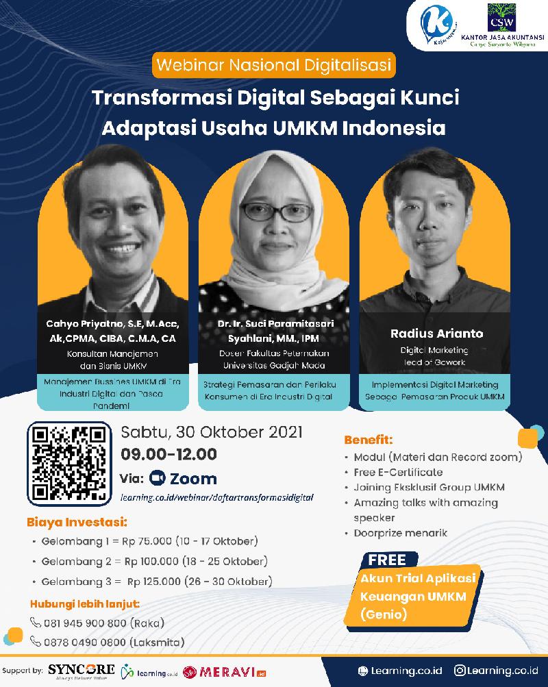 Pada saat ini, sektor UMKM dan pelaku usaha lainnya harus pandai dalam memanfaatkan teknologi digital untuk usahanya. Pemasaran produk yang semula dilakukan secara konvensional sekarang sudah beralih ke era digital, begitupun dengan strategi manajemen bisnis. Perubahan ini membuat semua menjadi serba otomatis. Hal ini menunjukkan bahwa dengan adanya digital akan memberikan kemudahan dalam berbagi, mengolah, maupun menyimpan informasi. Oleh karena itu, Meravi.id bekerjasama dengan learning.co.id, dengan bangga menyelenggarakan Webinar Nasional Digitalisasi, dengan